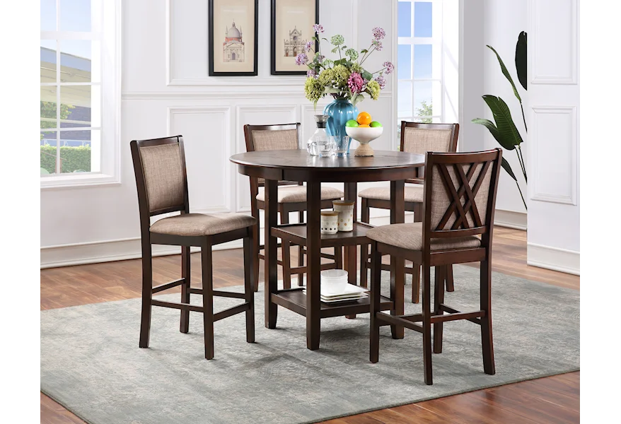 The Amy Transitional 5-Piece Counter Height Dining Set with 42" Round Table, made by New Classic,