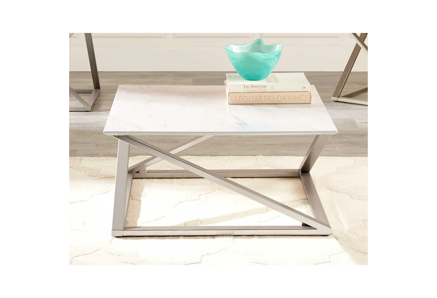 Brighten up your room with this sleek square cocktail table. The mixed media of the metal frame and faux marble top introduces a glam contemporary look to your living room. The asymmetrical matte chrome base brings an extra element of style to this minimalist design.