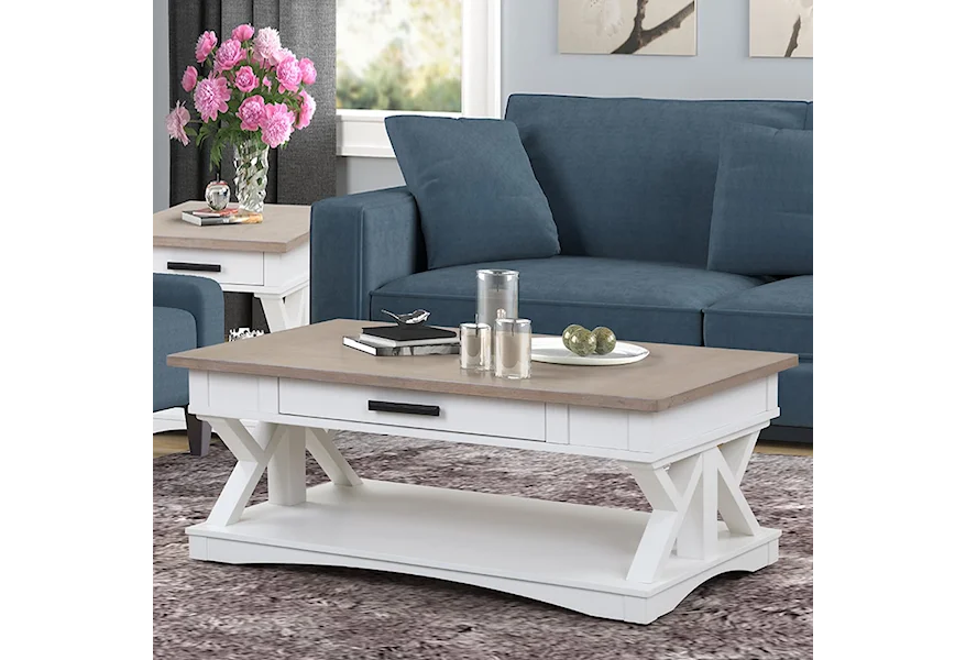 The Americana Modern Farmhouse Style 1-Drawer Cocktail Table, made by Parker House,